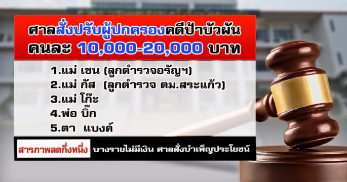 ศาลเยาวชนและครอบครัวสระแก้ว สั่งปรับผู้ปกครองของเยาวชน 5 คนที่ก่อเหตุฆาตกรรม “ป้าบัวผัน” คนละ 10,000 บาท แต่รับสารภาพลดเหลือ 5,000 บาท