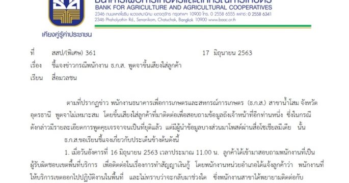 ธ.ก.ส.ชี้แจงเหตุพนักงานขึ้นเสียงใส่ลูกค้า สั่งสอบ พร้อมคาดโทษทางวินัย