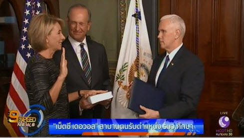 นางเบ็ตซี เดอวอส สาบานตนรับตำแหน่งรัฐมนตรีกระทรวงมนตรีศึกษาสหรัฐ คนใหม่