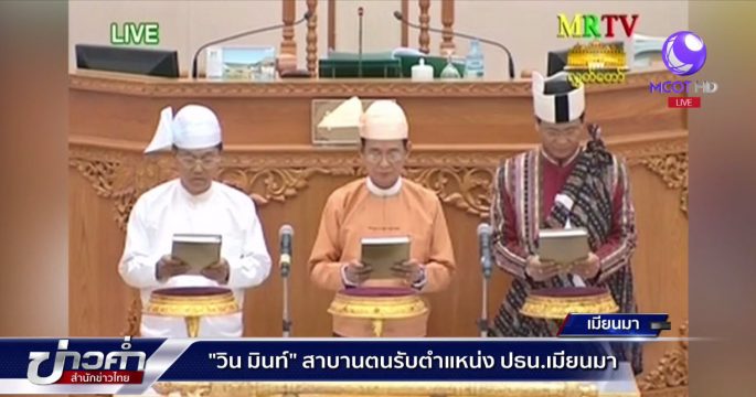 นายวิน มินต์ ทำพิธีสาบานตนรับตำแหน่งประธานาธิบดีเมียนมาอย่างเป็นทางการ หลังได้รับเลือกในสภา ด้วยคะแนนเสียงท่วมท้น ให้ดำรงตำแหน่งประธานาธิบดี ซึ่งในทางปฏิบัติไม่มีอำนาจบริหารประเทศมากมาย