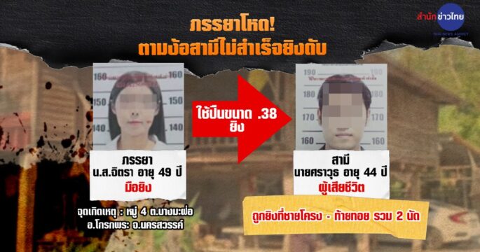 ตำรวจ สภ.สามโคก จับกุมมือยิงหญิงอายุ 40 ปี เสียชีวิต และชายอายุ 53 ปี ซึ่งเป็นสามี ได้รับบาดเจ็บ ในพื้นที่ อ.สามโคก จ.ปทุมธานี