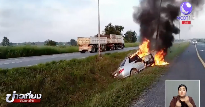2 สามีภรรยาขับเก๋งจากอรัญประเทศ มุ่งหน้า ฉะเชิงเทรา ก่อนรถลงร่องกลางถนน เกิดไฟลุกท่วมรถเก๋งวอดทั้งคัน