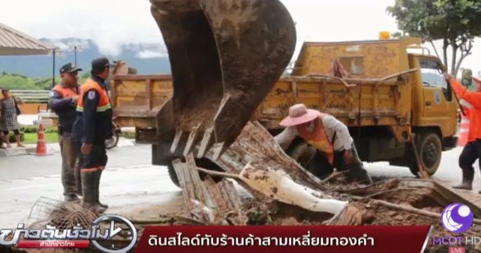 เทศบาลเวียงเชียงแสน เร่งนำเครื่องจักรไปตักดินภูเขาออกจากร้านค้าและถนนสายสามเหลี่ยมทองคำ-เชียงแสน บ้านสบรวก ตำบลเวียง อำเภอเชียงแสน จังหวัดเชียงราย