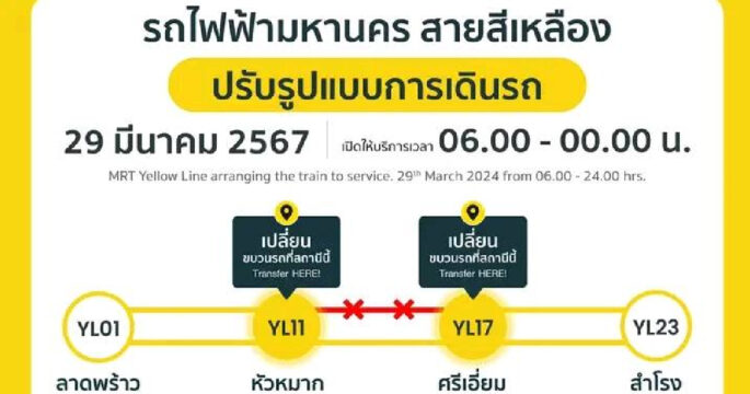 รมช. คมนาคม ตรวจการเดินรถของ MRT สายสีเหลือง ซึ่งเปิดเดินรถเต็มระบบตั้งแต่วานนี้ หลังเกิดเหตุรางนำไฟฟ้าหล่นบนคานทางวิ่งและอะไหล่ตัวยึดรางหล่นสู่ด้านล่าง ชี้ซ่อมบำรุงเสร็จเรียบร้อยและเพิ่มมาตรการป้องกันเกิดเหตุซ้ำ ขอให้ประชาชนมั่นใจในความปลอดภัย