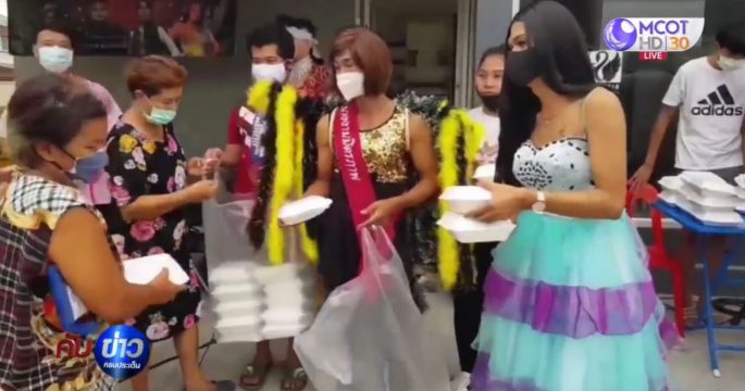 กลุ่มนางโชว์สาวประเภทสองที่พัทยา นำข้าวสารอาหารแห้ง อาหารกล่อง บะหมี่กึ่งสำเร็จรูป มาแจกให้กับชาวบ้าน ช่วยบรรเทาทุกข์จากผลกระทบการระบาดของโรคโควิด-19