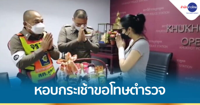 สาวขับรถหรูป้ายแดงย้อนศร เมาทำร้ายตำรวจ นำกระเช้าขอโทษตำรวจ สภ.คูคต พร้อมยอมรับผิดทุกข้อกล่าวหา ขอโทษสังคมด้วย ยืนยันจะไม่ทำแบบนี้แล้ว ด้านตำรวจไม่ถือโทษโกรธ รู้ว่าเมา เป็นตำรวจต้องระงับเหตุอยู่แล้ว