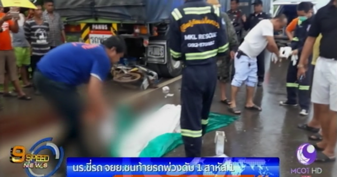 นักเรียน ม.1 ขี่รถจักรยานยนต์ฝ่าสายฝนพุ่งชนท้ายรถพ่วงจอดข้างทางเสียชีวิต เพื่อนนั่งซ้อนท้ายบาดเจ็บสาหัส