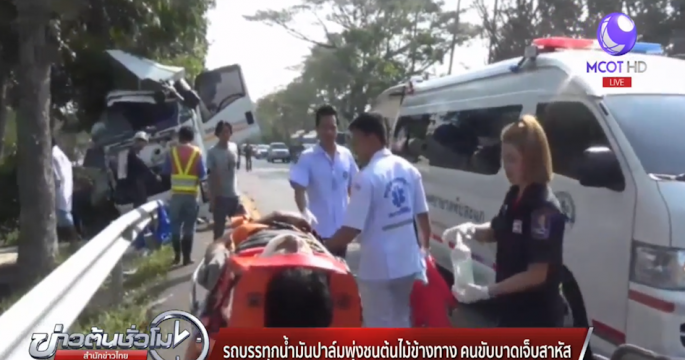รถบรรทุกน้ำมันปาล์ม เสียหลักพุ่งชนต้นไม้ เสยราวเหล็กกั้นถนนเพชรเกษมฝั่งขาล่องใต้ คนขับบาดเจ็บสาหัส คาดหลับใน