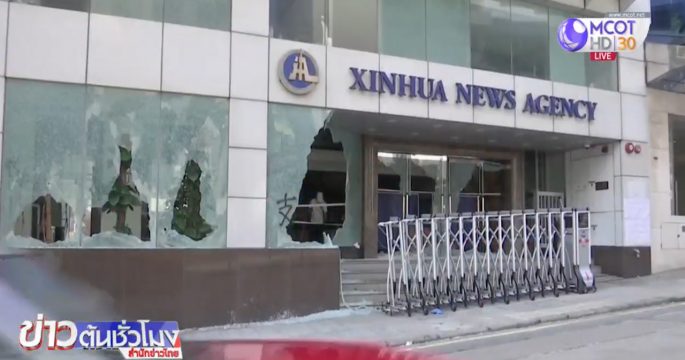 เจ้าหน้าที่ฮ่องกงเข้าเก็บกวาดเศษกระจกภายในสำนักข่าวซินหัว หลังกลุ่มผู้ประท้วงเข้าทุบทำลายเมื่อคืนนี้