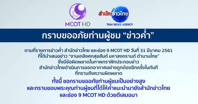 กราบขออภัยท่านผู้ชม “ข่าวค่ำ” สำนักข่าวไทย กรณีข้อผิดพลาดในภาพกราฟิกประกอบข่าว “งานเถลิงศกสุขสันต์ มหาสงกรานต์ ตำนานไทย” โดยได้ดำเนินการออกอากาศอย่างถูกต้องอีกครั้งในทันทีที่ทราบความผิดพลาดแล้ว