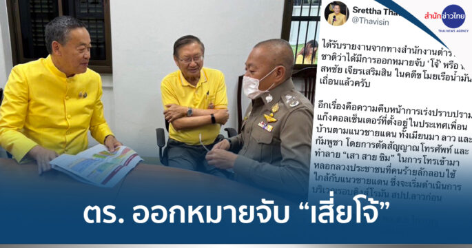 กรุงเทพฯ 19 ก.ค.- นายกฯ เผย ตร. ออกหมายจับ “เสี่ยโจ้” คดีขโมยเรือน้ำมันเถื่อนแล้ว จับตาแถลงข่าวบ่าย 3 โมงวันนี้ นายเศรษฐา ทวีสิน นายกรัฐมนตรี โพสต์ข้อความผ่านแอปพลิเคชัน X ระบุว่าได้รับรายงานจากทางสำนักงานตำรวจแห่งชาติ ว่า ได้มีการออกหมายจับ “โจ้” หรือ นายสหชัย เจียรเสริมสิน ในคดีขโมยเรือน้ำมันเถื่อนแล้วครับ อีกเรื่องคือความคืบหน้าการเร่งปราบปรามแก๊งคอลเซ็นเตอร์ที่ตั้งอยู่ในประเทศเพื่อนบ้านตามแนวชายแดน ทั้งเมียนมา ลาว และกัมพูชา โดยการตัดสัญญาณโทรศัพท์ และทำลาย “เสา สาย ซิม” ในการโทรเข้ามาหลอกลวงประชาชนที่คนร้ายลักลอบใช้ใกล้กับแนวชายแดน ซึ่งจะเริ่มดำเนินการบริเวณรอบคิงส์โรมัน สปป ลาว ก่อน สำหรับรายละเอียด พล.ต.อ.ไกรบุญ ทรวดทรง จเรตำรวจแห่งชาติ (จตช.) และ พล.ต.ท.ธัชชัย ปิตะนีละบุตร ผู้ช่วย ผบ.ตร.จะแถลงเวลาประมาณ 15.00 น. วันนี้ครับ .-316 -สำนักข่าวไทย
