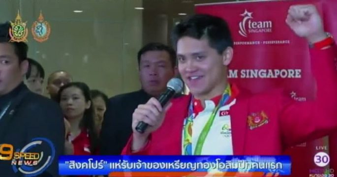 โจเซฟ สคูลลิง นักกีฬาเหรียญทองโอลิมปิกคนแรกของสิงคโปร์ เดินทางกลับถึงประเทศแล้ว ท่ามกลางการต้อนรับเยี่ยงวีรบุรุษจากแฟนๆ รวมทั้งคุณพ่อ