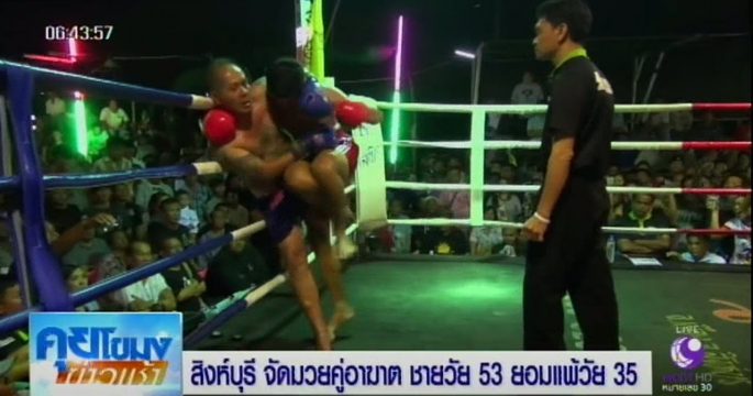 สิงห์บุรีจัดมวยคู่อาฆาต หนุ่มวัย 35 ปี กับลุง 53 ปี อดีตนักมวย เขม่นหน้ากันมานาน ผลนักมวยสูงวัยขอยอมแพ้ไปในยกที่ 2