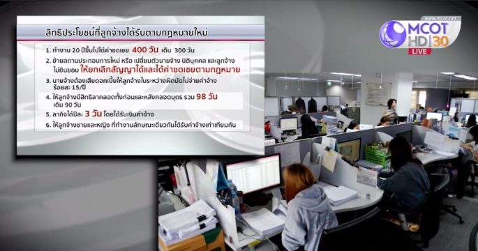 สนช.ผ่านกฎหมายคุ้มครองแรงงานฉบับใหม่ เพิ่มสิทธิประโยชน์แก่ลูกจ้างจำนวนหลายล้านคน ลาคลอดเพิ่มเป็น 98 วัน และกรณีถูกเลิกจ้างได้รับเงินชดเชยเป็น 400 วัน