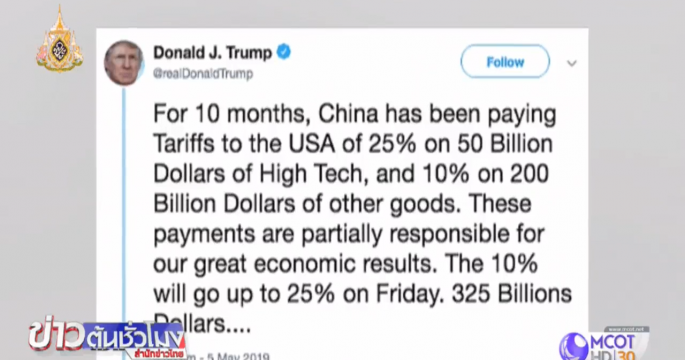 ดอนัลด์ ทรัมป์ ประธานาธิบดีสหรัฐ ทวีตขู่เพิ่มภาษีนำเข้าสินค้าเข้าจากจีนจากเดิม 10% เป็น 25% ในวันศุกร์นี้ (10 พ.ค.)