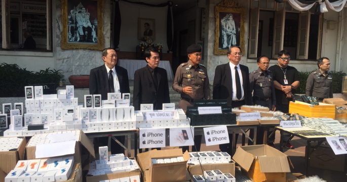 ตำรวจนครบาลยึดโทรศัพท์มือถือและอุปกรณ์เสริมโทรศัพท์ หลังเข้าตรวจค้นอาคารพาณิชย์ ย่านปทุมวัน ซึ่งเป็นจุดจำหน่ายและซุกซ่อนสินค้า