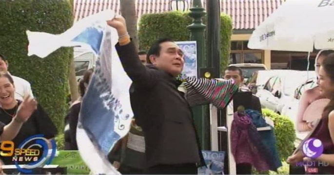 นายกรัฐมนตรีโชว์สะบัดผ้าเป็นพรีเซ็นเตอร์สินค้าผ้าบาติกเขียนมือจาก จ.แพร่ เหมือนในปกนิตยสาร OTOP เพื่อประชาสัมพันธ์สินค้า OTOP นายกรัฐมนตรีระบุว่าพร้อมทำทุกอย่างเพื่อเพิ่มมูลค่าและขายสินค้า OTOP ให้สูงขึ้น