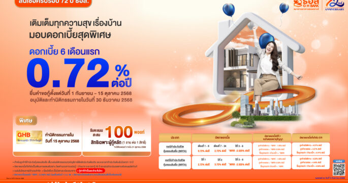 ธอส. ฉลองครบรอบ 72 ปี จัดสินเชื่อบ้านอัตราดอกเบี้ยต่ำ