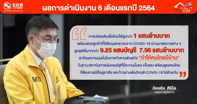 ธนาคารอาคารสงเคราะห์ (ธอส.) เผยผลการดำเนินงาน 6 เดือนแรกปี 2564 ปล่อยสินเชื่อใหม่ได้ 106,231 ล้านบาท เพิ่มขึ้นร้อยละ 5.20 และมีลูกค้าได้รับความช่วยเหลือผ่านทั้ง 18 มาตรการของ ธอส. จากสถานการณ์โควิด รวมกว่า 925,000 บัญชี เงินต้นคงเหลือ 796,500 ล้านบาท