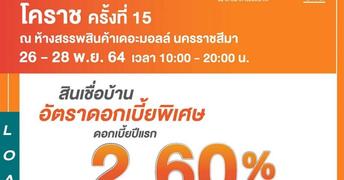 ธอส. เอาใจชาวเมืองย่าโม จัดโปรสินเชื่อบ้านดอกเบี้ยคงที่ปีแรก 2.60% ต่อปี บ้านมือสองราคาพิเศษ ให้ผ่อนดาวน์ดอกเบี้ย 0% นานสูงสุด 48 เดือน ในงานมหกรรมการเงินโคราช ครั้งที่ 15