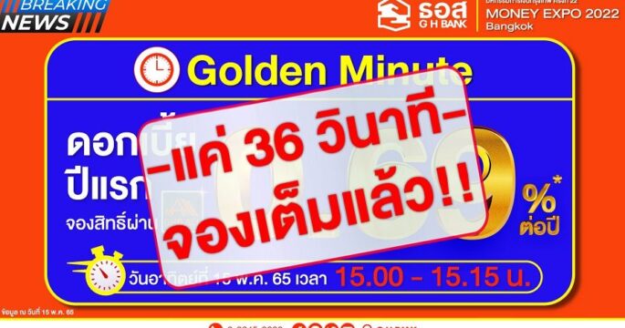 ธอส. จัดโปรโมชั่นพิเศษช่วง “นาทีทอง Golden Minute” สินเชื่อบ้านอัตราดอกเบี้ยปีแรก 0.69% ต่อปี ปรากฏว่ามีลูกค้าจองสิทธิ์คับคั่ง เต็มวงเงิน 450 ล้านบาท ภายในระยะเวลา 36 วินาที