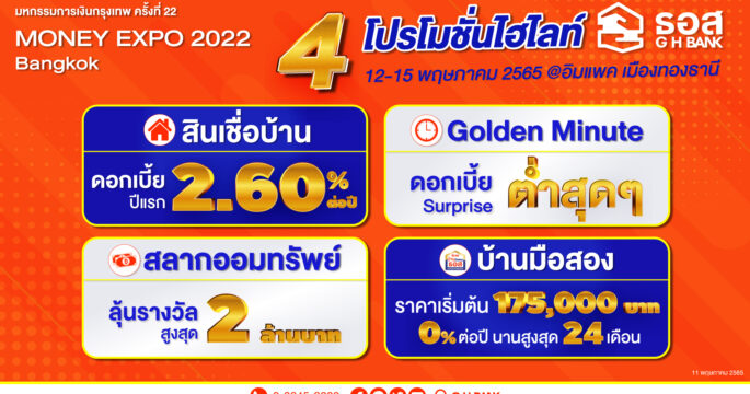 ธอส. จัดแผง 4 โปรแรง! สินเชื่อบ้านดอกเบี้ยปีแรกเพียง 2.60% ต่อปี ลุ้น Surprise ดอกเบี้ยต่ำสุดๆ ในช่วง Golden Minute ที่งาน Money Expo กรุงเทพฯ 2022