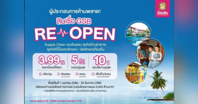 ออมสิน ออกสินเชื่อ GSB ReOpen เฟส 2 หนุนท่องเที่ยวขับเคลื่อนเศรษฐกิจไทย วงเงินกู้ไม่เกิน 5 ล้าน ดอกเบี้ยคงที่ปีแรกร้อยละ 3.99 ปลอดชำระเงินต้น 2 ปี ผ่อนนานสูงสุด 10 ปี