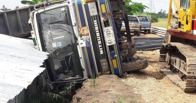 คนงานก่อสร้างเขื่อนริมคลองเมืองปทุมฯ พักเที่ยงนั่งกินข้าวในบ้าน เกิดเหตุไม่คาดคิด รถสิบล้อบรรทุกเหล็กเส้นพลิกทับดับ 3 เจ็บ 2 คาดสาเหตุดินอ่อนตัว