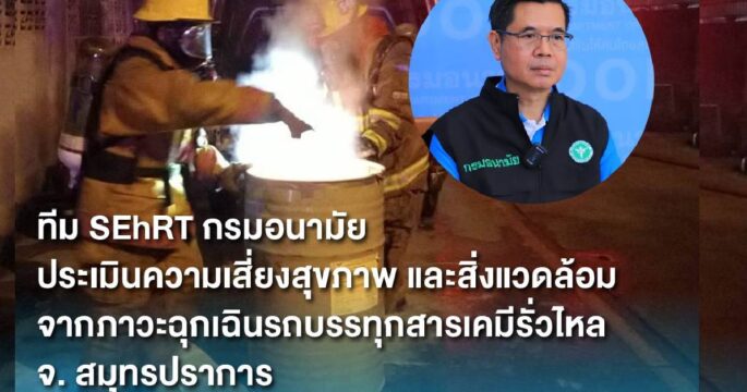 กรมอนามัย สนับสนุนทีม SEhRT ศูนย์อนามัยที่ 6 ชลบุรี ร่วมเฝ้าระวัง ประเมินความเสี่ยงสุขภาพ และสิ่งแวดล้อมจากภาวะฉุกเฉินรถบรรทุกสารเคมีรั่วไหล จังหวัดสมุทรปราการ ร่วมกับทีม สสจ.จังหวัดสมุทรปราการ เน้นย้ำสื่อสารประชาสัมพันธ์ให้คำแนะนำแก่ประชาชนในการดูแลสุขภาพของตนเองและครอบครัว โดยเฉพาะกลุ่มเสี่ยง กลุ่มเปราะบาง