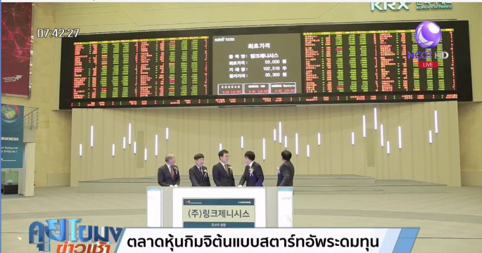 ภาพบรรยากาศพิธีเข้าทำการซื้อขายวันแรกของบริษัท Linkgenesis ซึ่งผลิตชิ้นส่วนของ LCD LED ป้อนให้กับยักษ์ใหญ่อย่างซัมซุง อิเล็กทรอนิกส์ ที่เข้าจดทะเบียนในตลาดหุ้นเกาหลี