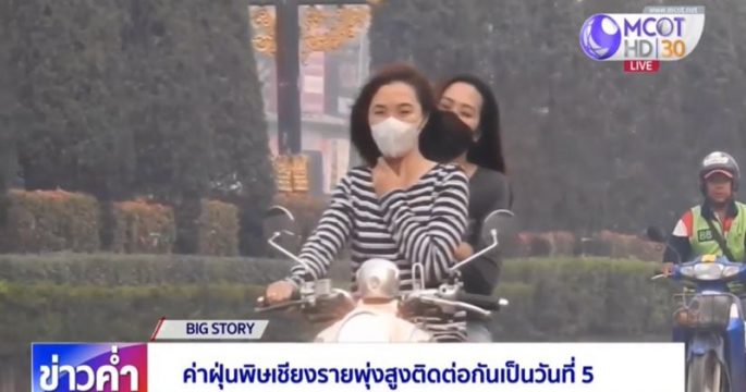 ปริมาณฝุ่นละอองขนาดเล็ก PM 2.5 จ.เชียงราย พุ่งสูงเกินค่ามาตรฐานอยู่ในเกณฑ์สีแดง มีผลกระทบต่อสุขภาพ โดยเฉพาะ อ.แม่สาย ค่าฝุ่นพิษสูงสุดในภาคเหนือติดต่อกันเป็นวันที่ 5