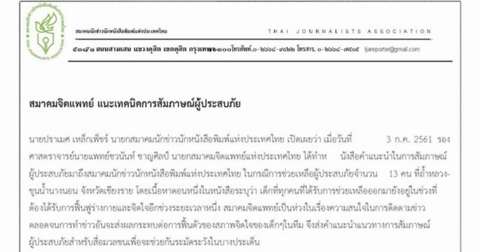 สมาคมจิตแพทย์ฯ แนะสื่อมวลชนสัมภาษณ์ผู้ประสบภัยใช้คำถามมุมมองด้านบวก วิธีปลอบใจกันให้มีกำลังใจ และควรป้องกันไม่ให้เกิดการซ้ำเติมทางจิตใจ