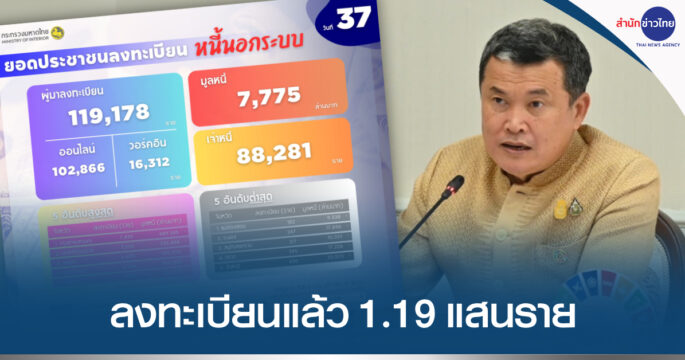 “มหาดไทย” เผยยอดหนี้นอกระบบครบ 37 วัน 7,775 ล้านบาท ประชาชนลงทะเบียน 119,178 ราย ไกล่เกลี่ยสำเร็จแล้ว 1,701 ราย มูลหนี้ลดลงร่วม 288 ล้านบาท กำชับทุกจังหวัด/อำเภอ เดินหน้ารับลงทะเบียนอย่างต่อเนื่อง