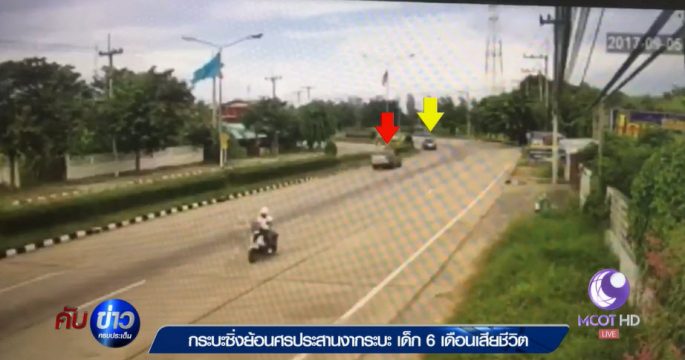 เปิดคลิปวงจรปิดจับภาพชัด รถกระบะ สีบรอน ขับย้อนศรในเลนขวาสุดพุ่งชนประสานงารถโตโยต้าสีดำ ที่ขับมาในเลนปกติ เด็ก 6 เดือน เสียชีวิต