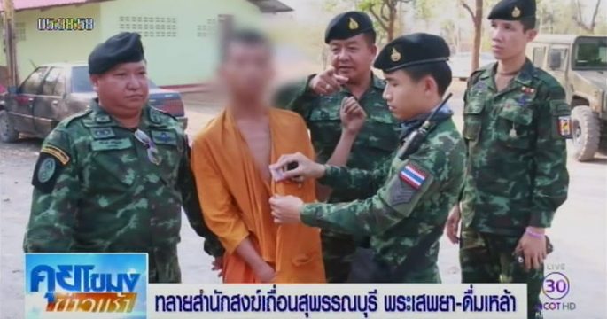ทหารฝ่ายปกครองบุกทลายสำนักสงฆ์ที่สุพรรณบุรี พระ เณรออกเรี่ยไรเงิน มั่วสุมดื่มสุราและเสพยาบ้า ตรวจค้นยังพบปืน มีดดาบ ซีดีลามก และไพ่อีก 1 สำรับ