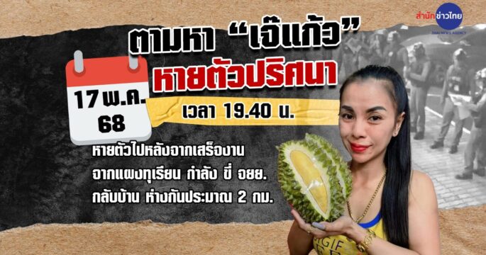 สุราษฎร์ธานี 19 พ.ค. – ยังไร้วี่แวว “เจ๊แก้ว” เจ้าของแผงทุเรียน หายตัว 2 วัน พร้อมทองหนัก 20 บาท-เงินสด 1 แสน สามีวอนตำรวจ-พลังโชเชียลช่วยตามหา หวั่นเกิดเหตุร้าย เมื่อวานนี้ (18 พ.ค.) ญาติของ น.ส.สุจิตรา หรือเจ๊แก้ว อายุ 43 ปี เจ้าของแผงทุเรียนในตลาดโพธิ์หวาย ต.บางกุ้ง อ.เมือง จ.สุราษฎร์ธานี เข้าแจ้งความกับตำรวจ สภ.เมืองสุราษฎร์ธานี ว่า น.ส.สุจิตรา หายตัวไปวันที่ 17 พฤษภาคม หลังจากเสร็จงานที่แผงทุเรียน และกำลังขี่รถจักรยานยนต์กลับบ้าน ซึ่งอยู่ห่างกันประมาณ 2 กม. ช่วงเวลาประมาณ 19.40 น. น้องสาวของเจ๊แก้ว เล่าว่า วันนั้นตนได้โทรศัพท์คุยกับพี่สาวและทราบว่าพี่สาวกำลังจะออกจากแผงทุเรียนเพื่อที่จะกลับบ้าน หลังจากนั้นก็เห็นผิดสังเกตว่าพี่สาวยังมาไม่ถึงบ้านเลยพยายามโทรหาแต่ก็ไม่มีคนรับ ปกติแล้วพี่สาวได้สวมใส่สร้อยคอทองคำน้ำหนัก 5 บาท เลทข้อมือทองคำน้ำหนัก 10 บาท […]