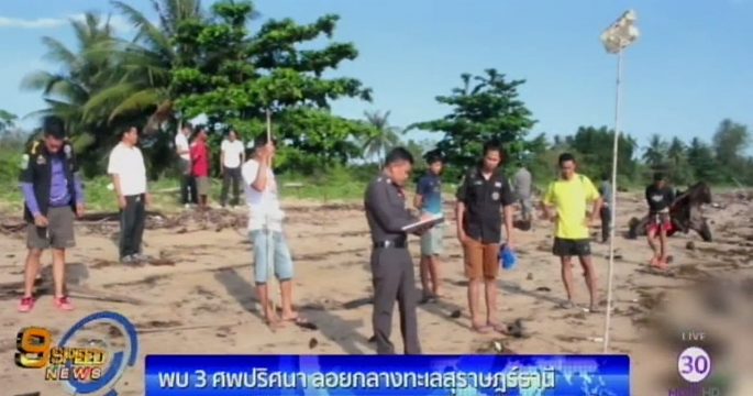 พบศพไม่ทราบที่มาลอยอืดกลางทะเล จ.สุราษฎร์ธานี รวม 3 ศพ ในสภาพเน่าเปื่อย จุดแรกศพชายถูกคลื่นซัดเกยตื้นที่ชายหาดบ่อปอ