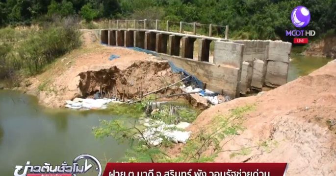 ฝายกักเก็บน้ำที่บ้านอาลอ–โดนแบน ต.นาดี จ.สุรินทร์ แตก กว้าง 5 เมตร น้ำไหลออกต่อเนื่่อง ชาวบ้านเกรงหน้าแล้งจะเดือดร้อนหนัก วอนหน่วยงานที่เกี่ยวข้องเร่งแก้ไข