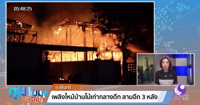 ไฟไหม้บ้านไม้เก่ากลางเมืองสุรินทร์กลางดึกวอดทั้งหลัง และลามไหม้บ้านที่อยู่ติดกันอีก 3 หลัง เจ้าหน้าที่ระดมรถฉีดน้ำดับไฟนานนับชั่วโมงเพลิงจึงสงบ