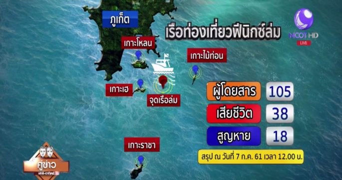 ล่าสุดตัวเลขของผู้เสียชีวิตจากเหตุเรือล่มที่เกาะเฮ จังหวัดภูเก็ต ที่เพิ่งได้รับรายงานเข้ามาว่า ขณะนี้ตัวเลขผู้เสียชีวิต 38 คน มีผู้สูญหายอีก 18 คน