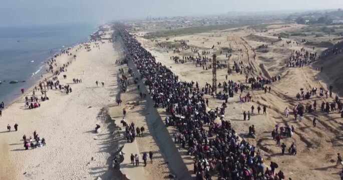 ผู้พลัดถิ่นและลี้ภัยสงครามชาวปาเลสไตน์จำนวนมากยังคงทยอยเดินเท้าไปตามถนนสายหลักริมชายฝั่งจากทางใต้ของฉนวนกาซา เพื่อกลับไปยังบ้านเรือนของตนเอง