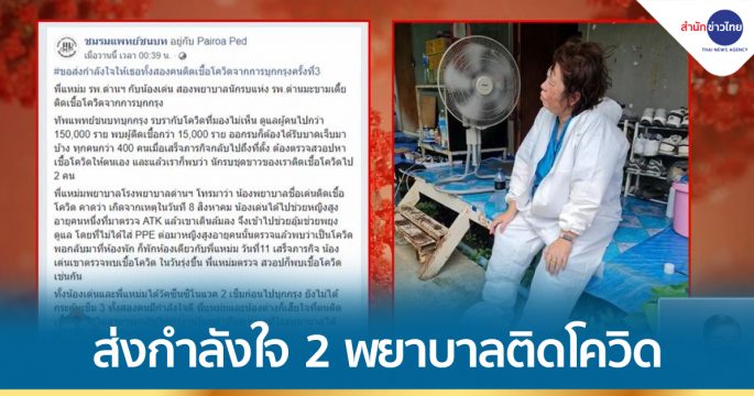 แห่ส่งกำลังใจสองพยาบาล รพ.ด่านมะขามเตี้ย ติดเชื้อโควิด หลังร่วมทีมแพทย์ชนบทบุกกรุง เพื่อช่วยตรวจคัดกรองโควิดที่ กทม. ทั้ง 2 คนบอกเสียใจติดเชื้อ ทำให้ไม่สามารถกลับไปทำงานได้ ต้องกักตัวรักษา 14 วัน