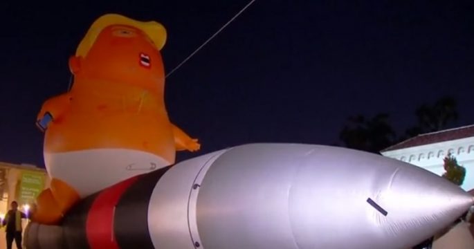 นักเคลื่อนไหวติดตั้งลูกโป่งยักษ์รูปทารกประธานาธิบดีโดนัลด์ ทรัมป์นุ่งผ้าอ้อมขี่จรวดไว้ที่สวนสาธารณะรัฐแคลิฟอร์เนีย