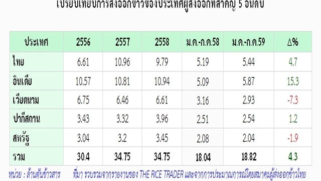 สมาคมผู้ส่งออกข้าวไทยเผยส่งออกข้าว 7 เดือนแรกปี 59 กว่า 5.438 ล้านตัน เพิ่มขึ้นร้อยละ 4.7 คาดเดือนสิงหาคมส่งออก 500,000 ตัน