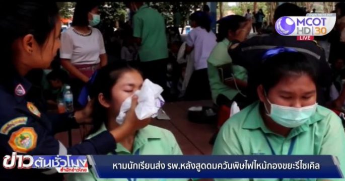 นักเรียนหลายสิบคนของโรงเรียนใน จ.ระยอง ถูกหามส่งโรงพยาบาล โดยมีอาการวิงเวียนศีรษะ แน่นหน้าอก อาเจียน หลังสูดดมควันพิษจากเหตุไฟไหม้กองขยะในโรงงานรีไซเคิลกลางชุมชนมาบข่า อ.นิคมพัฒนา ซึ่งอยู่ใกล้โรงเรียนเพียง 3-4 กม.