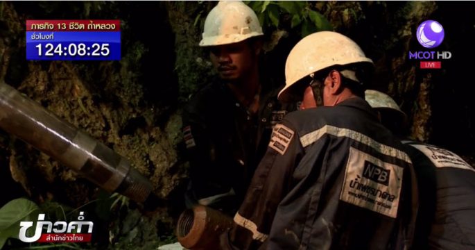 เจ้าหน้าใช้เครื่องขุดเจาะน้ำบาดาลเจาะใต้พื้นถ้ำหลวง ระบายน้ำจากด้านใน เพื่ออำนวยความสะดวกให้เจ้าหน้าที่เข้าไปค้นหา 13 ชีวิต หลังเมื่อคืนระดับน้ำสูงขึ้น จนหน่วยซีลไม่สามารถทำงานได้