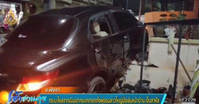 หญิงวัย 50 ปี นั่งเล่นอยู่หน้าบ้าน ถูกรถกระบะไหลจากเนิน กระแทกรถเก๋งที่จอดอยู่ข้างถนนไหลมาชนจนสลบ อาการสาหัส