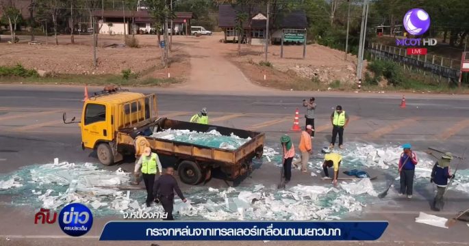 กระจกหล่นจากรถเทรลเลอร์เกลื่อนเต็มถนนสายเลี่ยงเมืองหนองคาย-ด่านพรมแดน สะพานมิตรภาพไทย-ลาว เป็นระยะทางยาวกว่า 100 เมตร ระดมเจ้าหน้าที่หลายฝ่ายเร่งเก็บกวาด