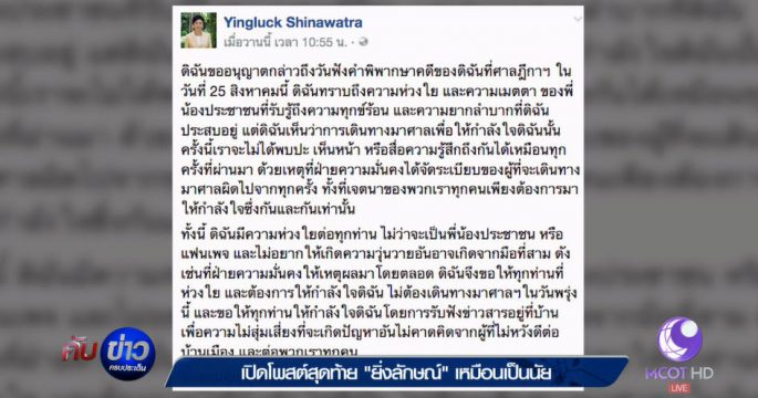 เปิดโพสต์ สุดท้าย “ยิ่งลักษณ์” อดีตนายกรัฐมนตรี ถึงมวลชน วิเคราะห์ถ้อยคำเหมือนเป็นนัย