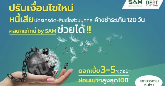 กรุงเทพฯ 2 พ.ค.- “คลินิกแก้หนี้ by SAM” ปรับเงื่อนไขใหม่ ช่วยคนเป็นหนี้เสียค้างชำระเกิน 120 วัน เข้าร่วมโครงการได้ หวังช่วยลดภาระหนี้ให้ประชาชน พร้อม 3 ทางเลือกผ่อนชำระหนี้ตามความสามารถ ดอกเบี้ยต่ำ 3-5% และผ่อนนานสูงสุดถึง 10 ปี